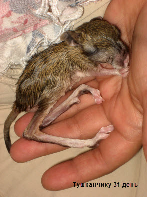 Для облегчения дефекации и уринации после каждого кормления мы массировали детенышам живот и аногенитальную область влажной ваткой. В возрасте 4-х недель тушканчики самостоятельно осуществляли эти функции, при этом процессу способствовали непродолжительные прогулки по полу после кормежки. Но если мы замечали у подросших тушканчиков затруднения с дефекацией, то возвращались к практике массажа. Однажды у двух детенышей был отмечен кал с кровянистыми выделениями. После 2-х дневного курса «Трихопола» (из расчета 5мг/кг) - раз в 8 часов орально в виде суспензии - явление прекратилось.