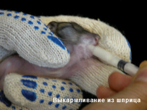 Обычно для выкармливания детенышей мелких млекопитающих мы используем пипетку с тонким кончиком,однако, в случае с тушканчиками лучше всего подошли 1,0 мл шприцы. При этом мы старались держать шприц перед зубами детенышей, выдавливали им смесь в рот по капле, делая